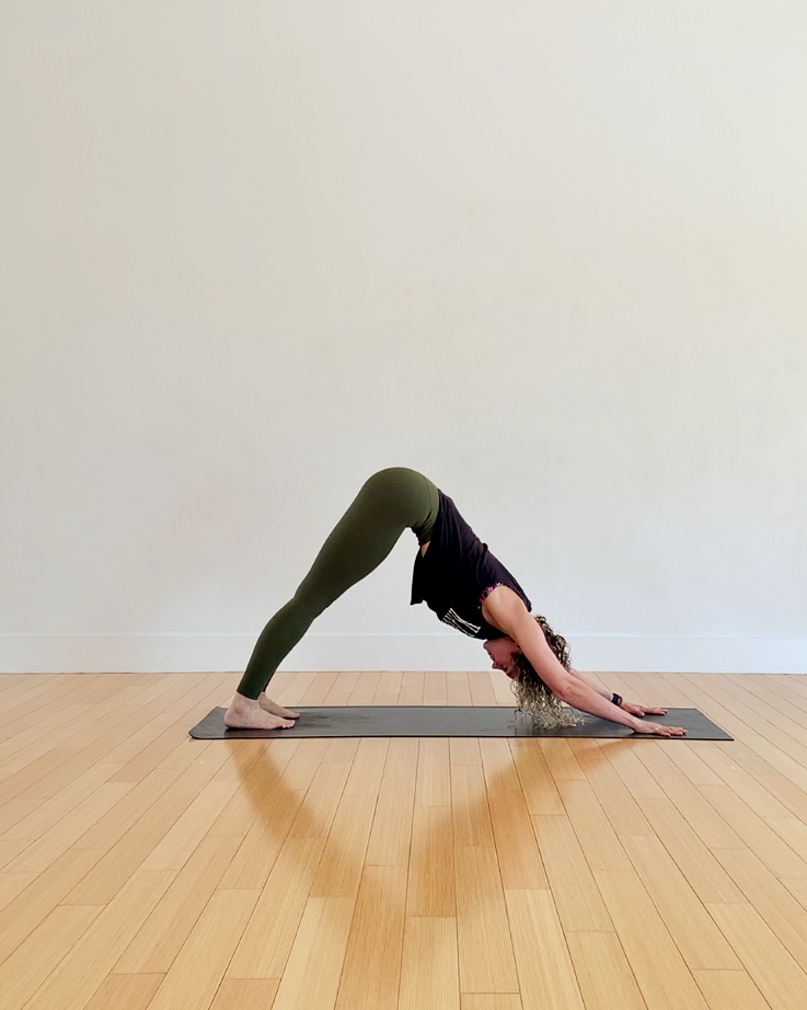 Over the years, as I learned ways to feel my body, I realized that my approach to the posture was largely passive. Yes, my heels could press to the floor, and if I locked my joints in place, I could just hang the weight of my body off the skeleton like a droopy yogi hammock. My down dog was a backbend and it was stagnant.